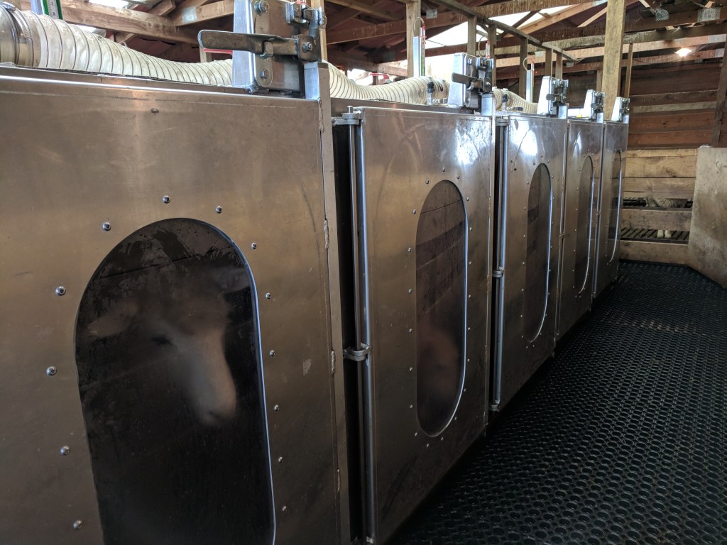 I should note that there are also devices that use a small amount of pellets to lure animals into sticking their faces into fume hoods for spot methane readings. These are used in the new LIC and CRV dairy bull facilities to assess the next generation of dairy sires while they spend 35 days getting their feed intake measured at the same time. However, there is nothing an animal can’t do if it is given enough time and the promise of free treats. So these machines are generally only used in specific scenarios where high-tech babysitting is on hand to repair everything the tongue touches.